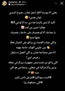 ووجهت مي عمر، عبر حسابها الرسمي بموقع التواصل الاجتماعي “فيسبوك” من خلال خاصية “الاستوري”، قائلة: ” يعني يوم ما أفكر أعمل لجان، هروح اشتري لجان هندي، أكيد أنا مش بالسذاجة دي، ده أنا لو في كي جي تو هفكر أحسن من كدا”.